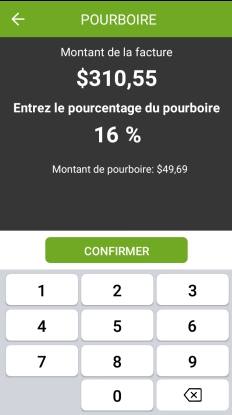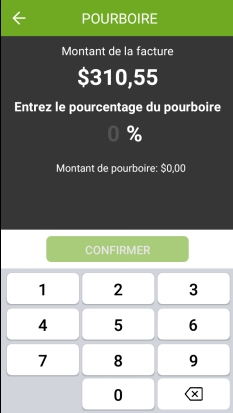 Notez également que la valeur du montant du pourboire est mise à jour en temps réel lorsque le client tape le pourcentage. Ceci est prévu pour que le client sache immédiatement le montant qui sera ajouté à l'addition en tant que pourboire, selon le pourcentage saisi.