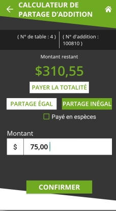 • L'addition sera-t-elle payée en espèces ou par carte ? • L'addition sera-t-elle payée en totalité par un seul client, ou partagée entre les les clients présents ? • Si le paiement doit être partagé, le sera-t-il en montants égaux ou inégaux ?