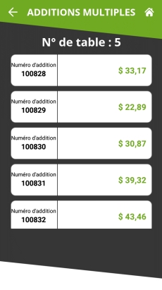 Lorsqu'une table contenant plusieurs additions imprimées est sélectionnée, la liste des additions disponibles s'affiche. Sur un écran de terminal de paiement typique, jusqu'à 5 additions peuvent être affichées à la fois. S'il y a plus de 5 additions, la liste peut être parcourue en balayant l'écran de haut en bas.