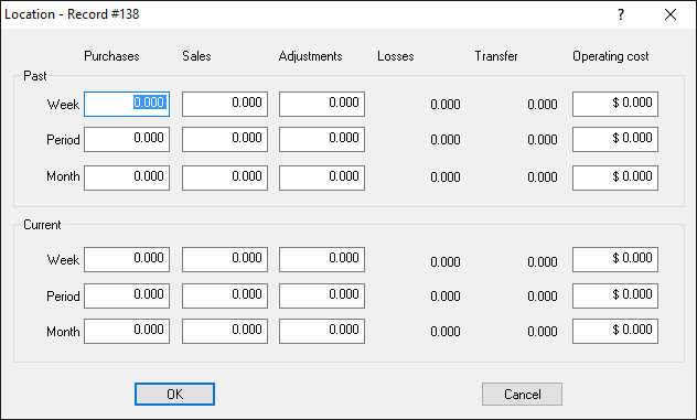 These fields displays the inventory figures recorded for the past and present Week, Period, and Month.