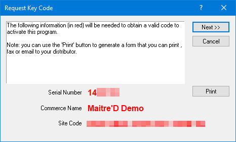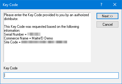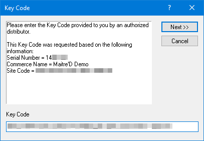 Maitre'D will now request a Key Code. Paste the Activation Code which you copied from the website by pressing CTRL + V on your keyboard. Click Next >>