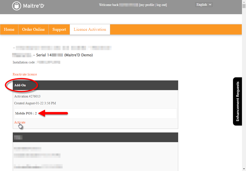 Available add-ons will be listed here. Locate the Add-On you wish to activate and click the Activate link. For the purpose of this example, we are activating an add-on for two new Mobile POS workstations.