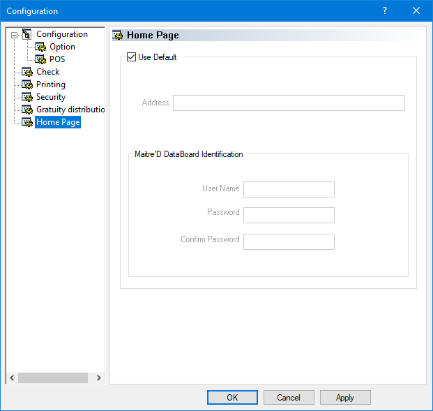 The Use Default option needs to be disabled for this field to become accessible. Enter the URL of the webpage that will be used to replace the default local home page for the Point of Sale Control module.