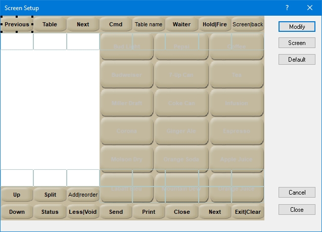 The main screen layouts are the backbone of the POS workstation display. They contain essential command keys such as Print, Close, etc, and may also contain quick links to custom command lists and preferential screens.