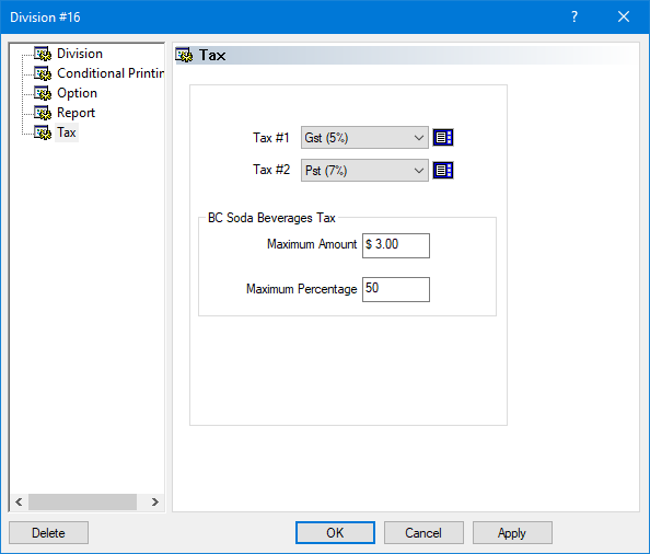 The divisions used for sodas are taxable by both the GST (5%) and PST (7%). Here are the required settings: