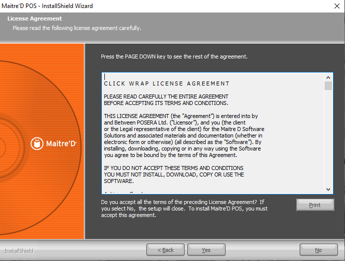 InstallShield Wizard - Welcome The Maitre'D POS End-User License Agreement (EULA) will be displayed. Please take time to read and understand the terms of the license agreement and click Yes to accept the terms.