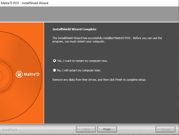 Move progress If you restart the computer at this point, the Maitre'D POS application will start automatically after you logon to Windows.