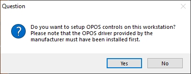 You will be prompted whether to setup the OPOS Controls for this workstation. If OPOS devices are attached to this POS, click Yes. Otherwise, click No. Note that it is always possible to manually run the OPOS setup (OPOSetup.exe) utility later, from the C:\WS folder.