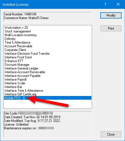 Make sure that the Mobile POS option is present. The number next to Mobile POS is the maximum number of mobile POSes that can be used at the same time on your Maitre'D POS System.