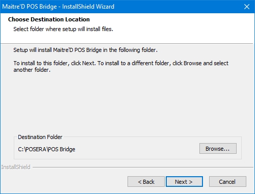 Select the install destination. By default, files will be installed to C:\POSERA\POS Bridge\. It is highliy recommended to use the default settings. Do not change this setting unless you know exactly what you are doing. Click Next > to proceed.