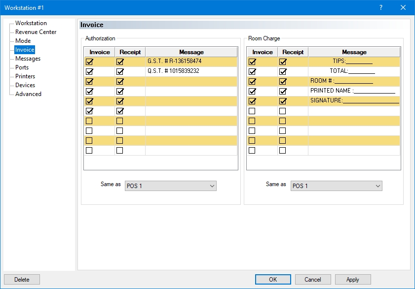 The Invoice branch of the workstation options allows you to configure custom messages to be printed on regular guest checks as well as Room Charge guest checks.