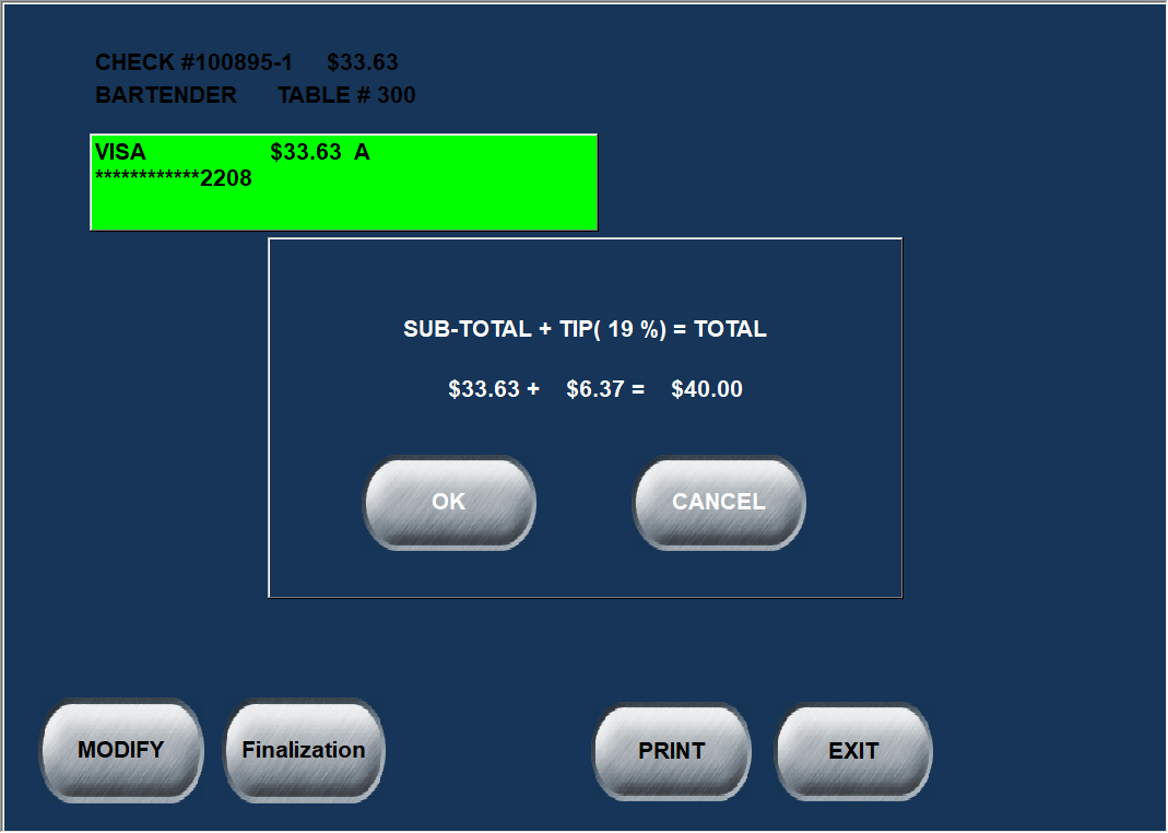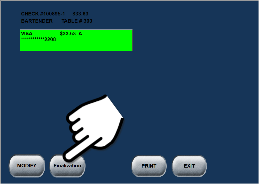 The Finalization is the process by which the actual purchase amount is funded from the credit card. At the same time, any tips that the customer wishes to give to the employee are added to the final amount.