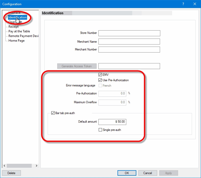 Enable this option to allow the EFT-RTI v 1.0 interface to perform pre-authorizations, which consists of validating that enough credit is available and setting aside a predetermined amount to cover eventual purchases. This is required to use Bar Tabs.