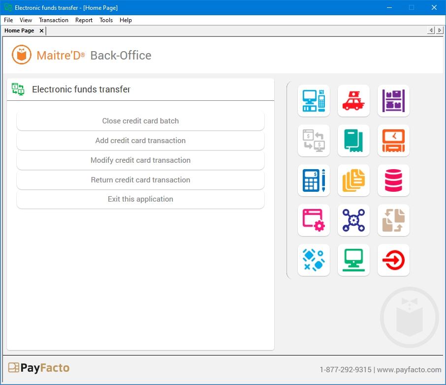 The Electronic Funds Transfer (E.F.T.) module allows to authorize and process credit card purchases electronically through a financial institution. Maitre'D communicates to verify and process credit and debit cards. For each transaction processed by credit card, Maitre'D communicates with the clearing house through an Internet connection and prints transaction records