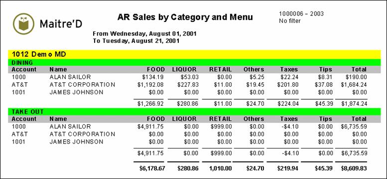 Maitre'D's account receivable sales by category and Revenue Center report shows you sales closed to customers' accounts divided by Divisions Categories and Revenue Centers, according to your specifications. From the report filter window, select the dates, Revenue Centers, modes, customers, categories and divisions to be included in the report. The following is a sample of the account receivable sales by category and Revenue Center report:
