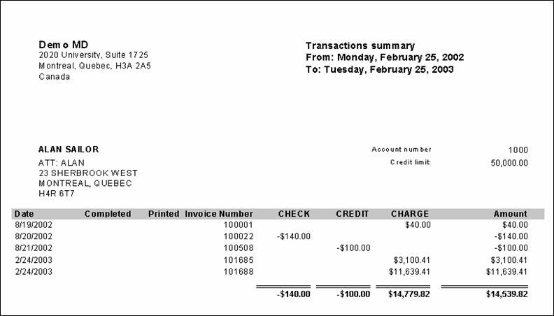 Maitre'D transactions in column report provides you with customer address, account number, credit limit on the account and the date range for which you see the transactions. It displays transaction under columns titled Check, Credit and Charge, to help with bank reconciliation. From the report filter window, you select the dates and customers to be included in the report, as well as whether or not to include inactive accounts. The following is a sample of the transactions in column report:
