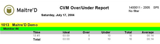 Maitre'D's CVM Over/Under report prints the number of checks for which the delays (in seconds) between the order on the workstation and the completion in the kitchen were over or under the ideal delay.