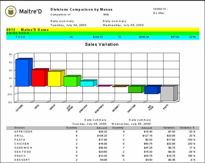 You get a detailed list of all the information shown on the graphic for the 2 dates or the 2 period of time selected. The divisions are sorted in the order you programmed them in the Maitre'D Back-Office. The first set of columns shows information on the fiscal date and the second set of columns shows information on the comparison date.