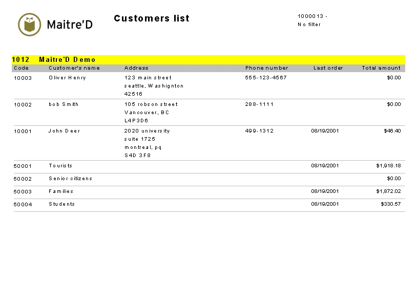 The following is a sample of the Customers List report:
