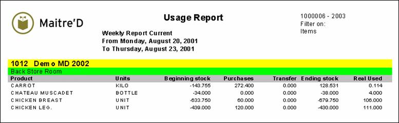 Maitre'D's Usage Report shows information based on real quantity used per item, based on beginning stock, purchases, transfers and ending stock for the time period requested. This report could be useful when planning your purchases. From the report filter window, select the appropriate period, suppliers, inventory items, categories, groups, locations and departments to be included in the report. The following is a sample of the usage report: