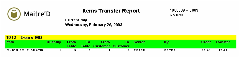 Maitre'D items transfer report provides you with a list of all items transfer done from one table and/or client to another for a selected date or period of time. From the report filter window, select the appropriate date, employees and items to be included in the report. The following is a sample of the items transfer report: