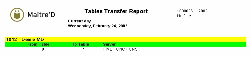 Maitre'D tables transfer report provides you with a list of all tables transfer done from one table number to another for a selected date or period of time. From the report filter window, select the appropriate date and employees to be included in the report. The following is a sample of the tables transfer report: