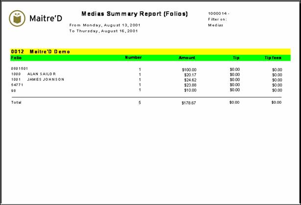 Maitre'D medias summary (Folios) report provides you with a total quantity and a total $ amount of the invoices for each folio number for the selected date or period of time. It also gives you a total tip amount and total tip fees per folio number. From the report filter window, select the appropriate date and time range, Revenue Center, media type and employees to be included in the report. Take note the media type filter is for the media type 2 to 25 only from your POS Control module. The following is a sample of the medias summary (Folios) report: