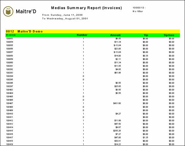 Maitre'D medias summary (Invoices) report provides you with a total quantity and a total $ amount for each invoice for the selected date or period of time. It also gives you a total tip amount and total tip fees per invoice. Take note each media type must have the field "included in report" enabled to show up on the media report. From the report filter window, select the appropriate date and time range, Revenue Center, media type and employees to be included in the report. Take note the media type filter is for the media type 2 to 25 only from your POS Control module. The following is a sample of the medias summary (Invoices) report: