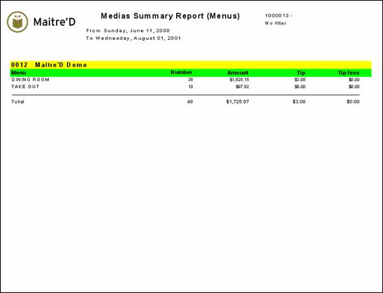 Maitre'D medias summary (Revenue Centers) report provides you with a total quantity and a total $ amount of the invoices for each Revenue Center for the selected date or period of time. It also gives you a total tip amount and total tip fees per Revenue Center. Take note each media type must have the field "included in report" enabled to show up on the media report. From the report filter window, select the appropriate date and time range, Revenue Center, media type and employees to be included in the report. The following is a sample of the medias summary (Revenue Centers) report: