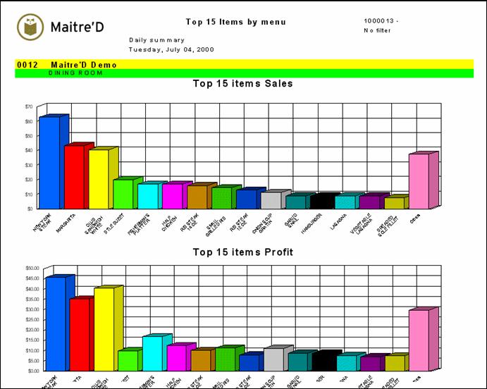 Maitre'D Top 15 items by Revenue Center Report shows the top 15 items sold by Revenue Center for the date or the period of time requested. From a report filter window, you select the appropriate date or date range, categories, divisions, Revenue Centers and modes for information needed. The following is a sample of the Top 15 items by Revenue Center report: