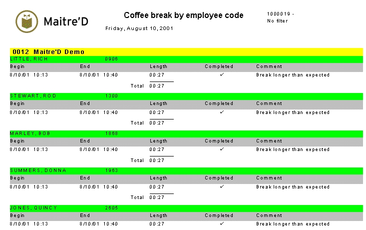 Maitre'D coffee break by employee code report shows each employee break and its length. The report lets you know if the employee is still in its coffee break and if not, the report shows a comment to let you know if it was shorter or longer than your T&A pre-defined coffee break time. The report is sorted by employee code. From the report filter window, select the appropriate week or custom date and employee(s) to be included in the report.