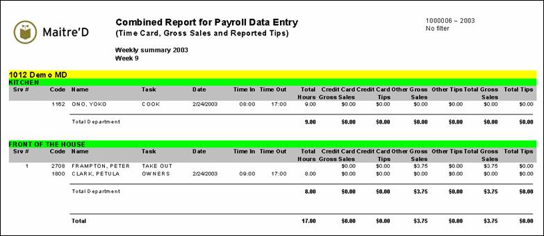 Maitre'D combined report for payroll data entry combines the information you get from the time card report and the TEFRA report. This report is used to see in one glance all the data needed for payroll data entry. From the report filter window, select the dates, departments, tasks and employees to be included in the report. NOTE: Maitre'D does not report employee under training. TEFRA stands for Tax Equity and Fiscal Responsibility Act. The following is a sample of the combined report for payroll data entry