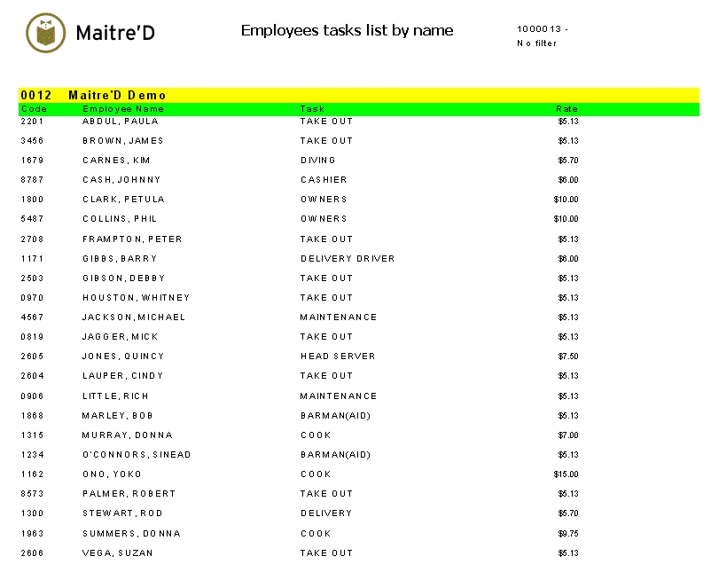 Maitre'D employee task list by name report gives you a list of T&A employee(s) with each employee's task(s) and task rate. This report is sorted by the T&A employee name. From the report filter window, select the employee(s) and task(s) to be included in the report.