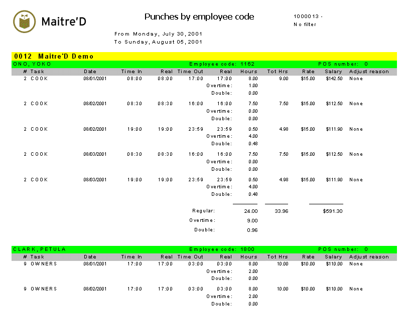 Maitre'D punches by employee code report gives information on all the punches that were done for specific period of time. This report is sorted by employee code from the POS Control module. This report shows detailed information such as the regular hours, overtime, and double hours worked for each employee. You also get information on their hourly rate and paid salary. From the report filter window, select the date or date range and the employee(s) to be included in the report.
