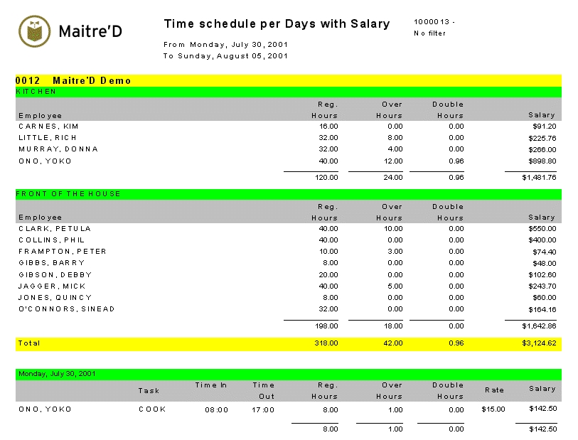 Maitre'D schedule per days with salary report shows information on the scheduled hours for each T&A department with the employee name, assigned hours and payable salaries for the current week or the next week. It gives you each employee's schedule with his or her payable salary sorted by date. From the report filter window, select the current week or next week and the employee(s) to be included in the report.