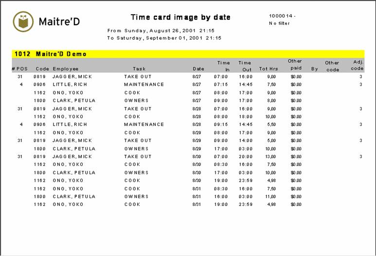 Maitre'D time card by date report shows information regarding the clocking time of the employees along with their tasks and other pays, and the POS supervisor number that made any editing along with any reasons. A legend is shown at the end of the report to help you retrieve an adjustment reason or other code. This report is sorted by T&A clock in date. From the report filter window, select date or date range and employee(s) to be included in the report.