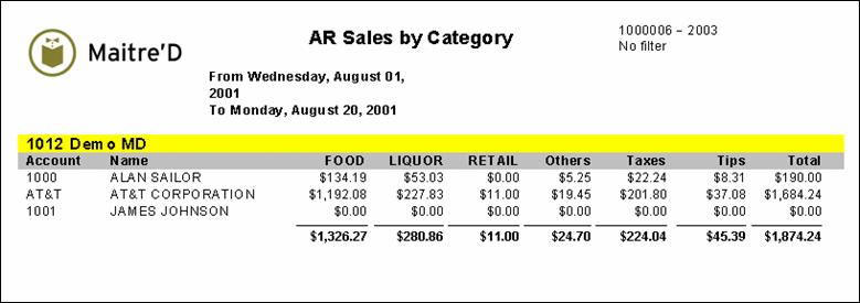 Maitre'D's account receivable sales by category report shows you sales closed to customers' accounts divided by Divisions Categories, according to your specifications. From the report filter window, select the dates, customers, categories and divisions to be included in the report. The following is a sample of the account receivable sales by category report: