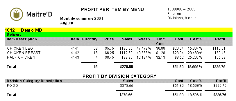 The following is a sample of the profit per item by Revenue Center report: