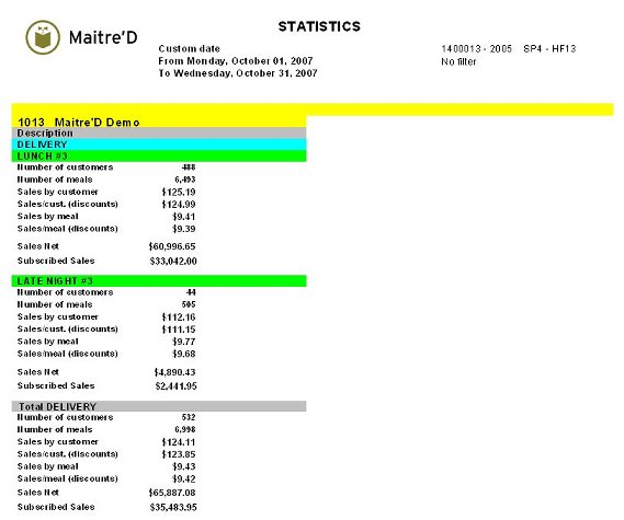 Maitre'D's Statistics report shows you sales details, by Modes and by Revenue Centers, as well as for the whole restaurant's totals with statistics, on a last page. From the report filter window, select the appropriate date frame to be included in the report. The following is a sample of the Statistics report: