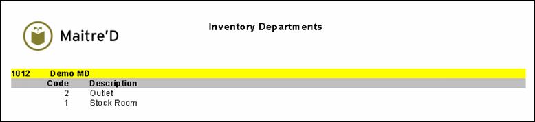 Maitre'D's departments report shows you all departments used to group Locations together. The following is a sample of the departments report: