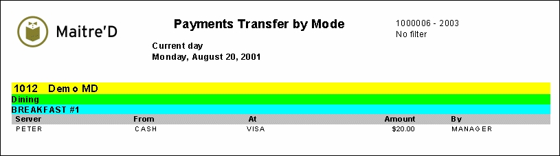 Maitre'D payments transfer by mode report provides you with a list of all payments transfer done on server readings by mode for a selected date or period of time. From the report filter window, select the appropriate date, employees, media Revenue Centers and modes to be included in the report. The following is a sample of the payments transfer by mode report: