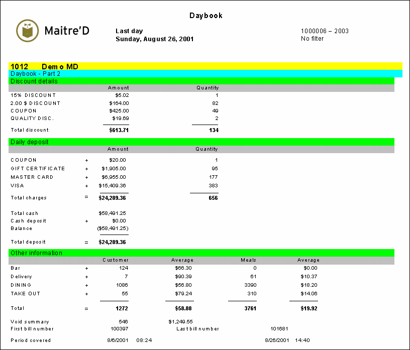 Maitre'D's Daybook report shows you sales details, by modes and by Revenue Centers, on the first pages, as well as discount details, deposit details, and statistics, on a last page. From the report filter window, select the appropriate date to be included in the report. It is also possible to force the user to enter the deposit amount before they can run the EOD. If you wish to do so, the "Daily deposit" option under P.O.S. Control / View / Option must be enabled. The following is a sample of the daybook report: