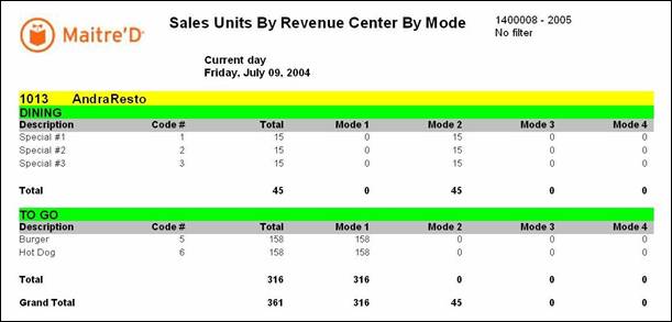 The following is a sample of the Sales Units By Revenue Center By Mode report
