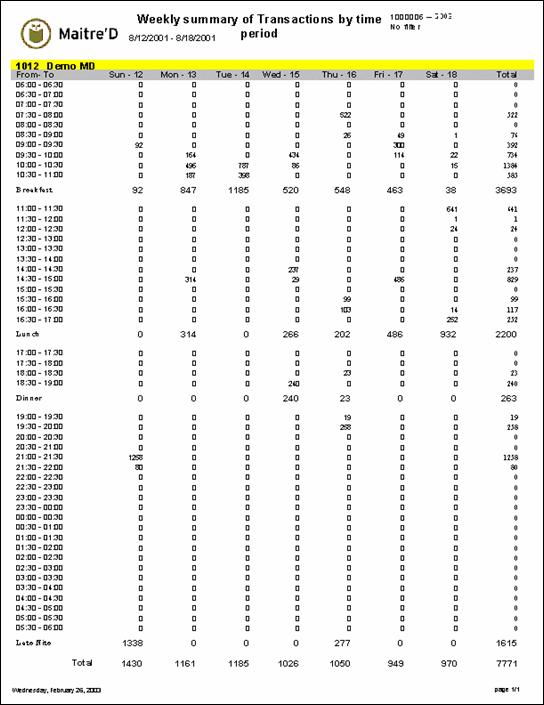 Maitre'D weekly summary of transactions by time period report shows transaction count information by half-hour time slices for the week requested. From the report filter window, select the appropriate start date and time slices to be included in the report.
