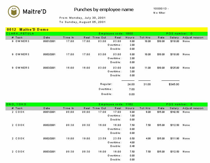 Maitre'D punches by employee name report gives information on all the punches that were done for specific period of time. This report is sorted by employee name from the POS Control module. This report shows detailed information such as the regular hours, overtime, and double hours worked for each employee. You also get information on their hourly rate and paid salary. From the report filter window, select the date or date range and the employee(s) to be included in the report.
