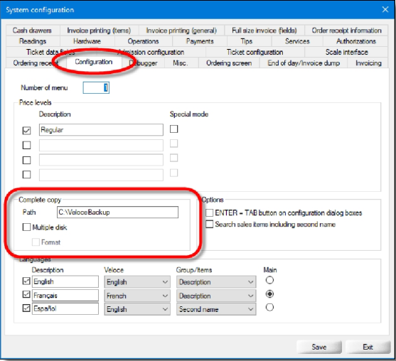4. Cliquez sur l'onglet Configuration et localisez la section Copie complète.