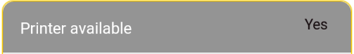 If your payment terminal does not have an integrated printer, the printing options will not be available, and the Printer section of the app settings will display whether a printer is available or not by displaying Yes or No for the Printer available function, as shown in the example below: