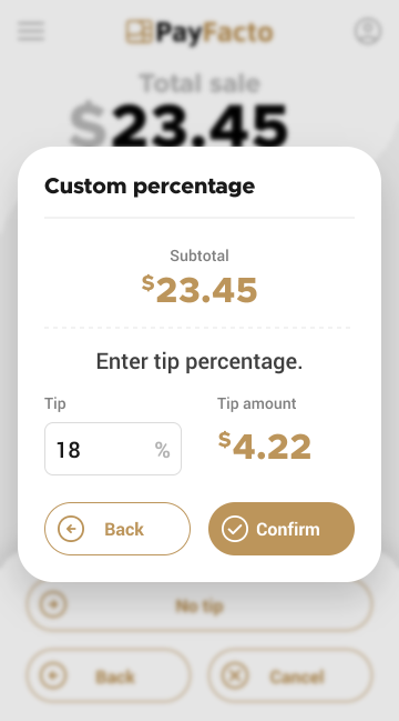 Touching a preset automatically adds the selected tip amount to the transaction.