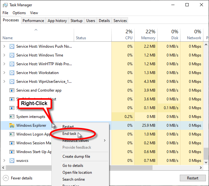 In the Processes tab, scroll all the way down to the Windows Explorer process. Right-Click the Windows Explorer process, and select the End Task option.