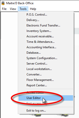 From the main back-office screen, click on the Tools menu, and select the User Editor option.